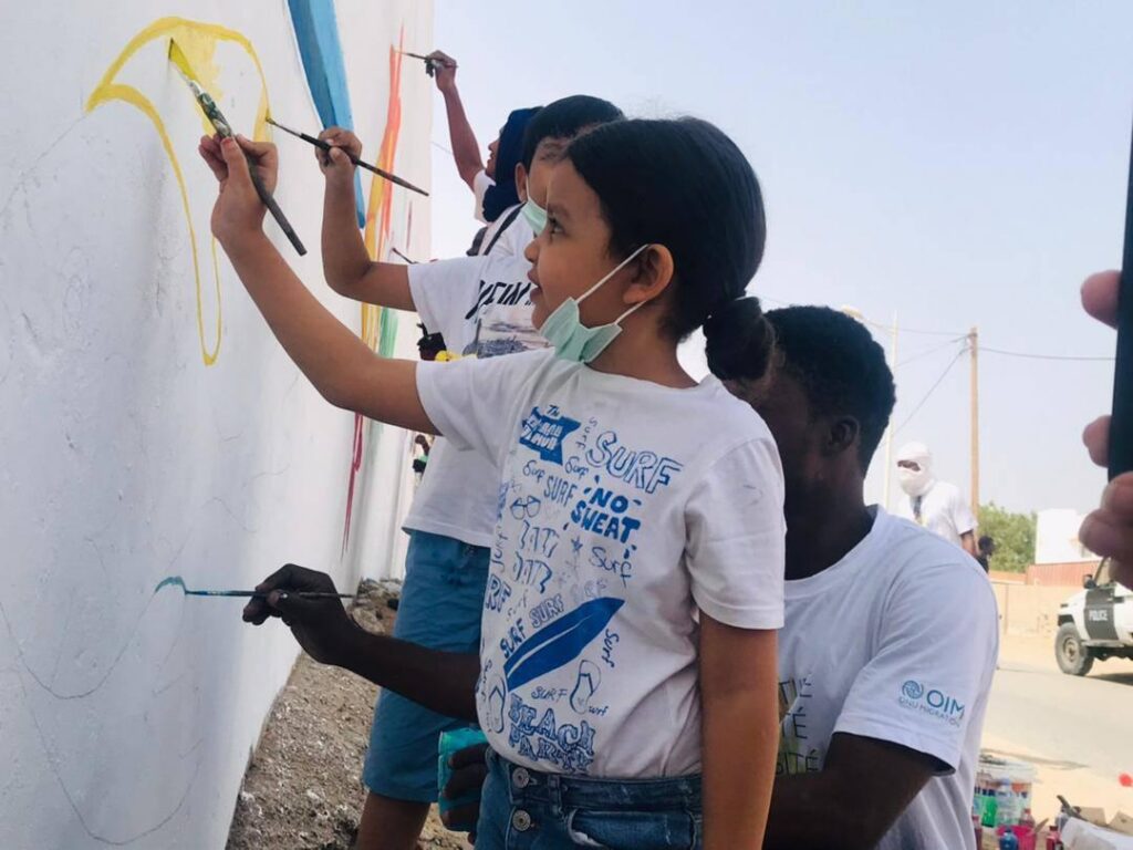 Aux côtés d’organisations internationales telles que l’OIM (Organisation internationale pour les migrations) et l’OMN (Organisation mondiale de la nutrition), Patrick réalise des fresques dans des écoles, associant symbolisme culturel et messages sociaux puissants.